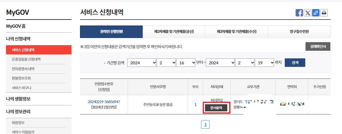5. 서비스 신청내역에서 문서출력을 클릭합니다.