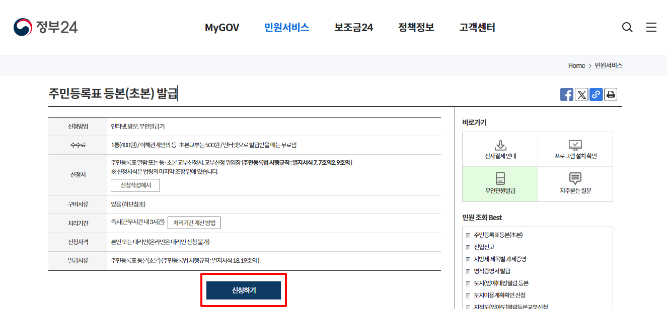 3. 주민등록표 등본 발급 페이지에서 신청하기를 클릭합니다.