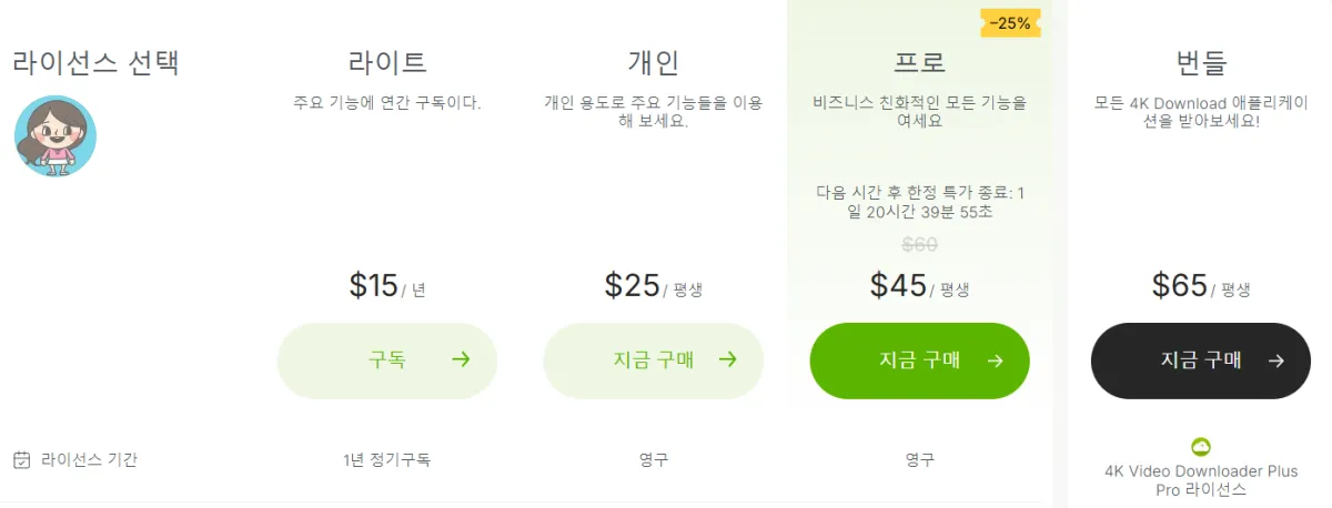 라이선스 선택 | 라이트 | 개인 | 프로 |