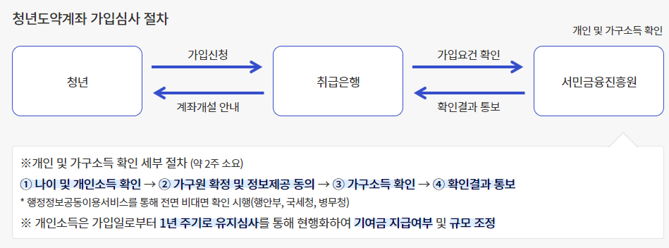 청년도약계좌는 일반 은행 적금처럼 신청한다고 바로 가입할 수 있는 것은 아니고 가입신청 후 심사 절차를 거치게 됩니다. 매월 취급은행에서 가입신청을 받고 약 2주동안 서민금융진흥원에서 심사를 하게 되고 익월 초에 계좌개설을 할 수 있습니다.