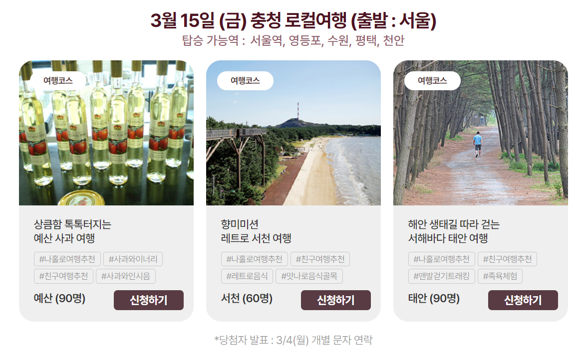 - 1차 접수기간 2/20(화) ~ 2/27(화) → 여행날짜 3/8(금), 3/15(금), 3/16(토)