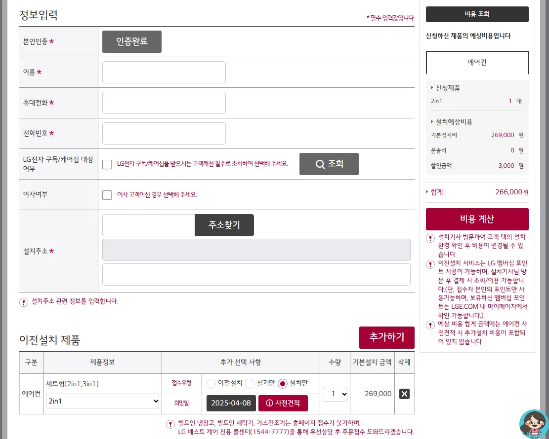 LG 에어컨 2in1 에어컨 공식 설치예상 비용은